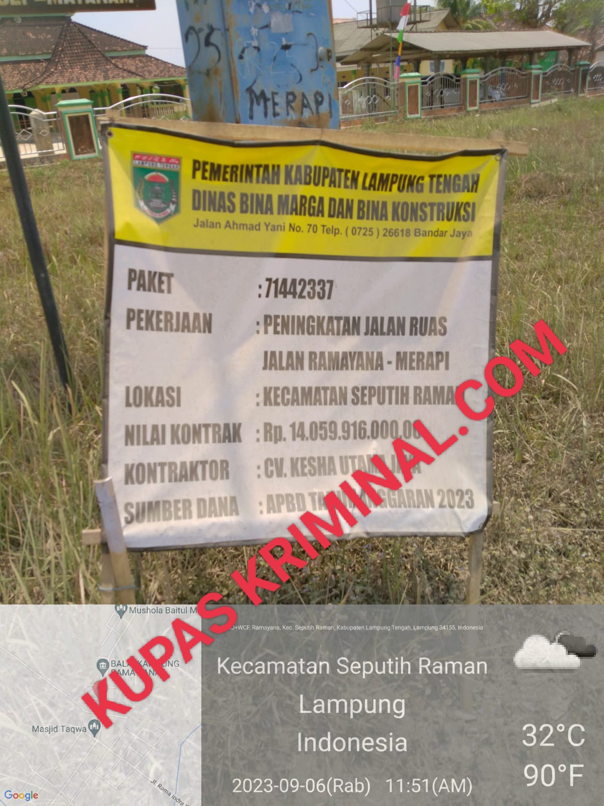 Lampung Tengah Proyek peningkatan jalan ruas jalan Ramayana – Merapi, dengan sumber dana APBD tahun Anggaran 2023 dengan Nilai kontrak Rp 14. 059.916.000,00