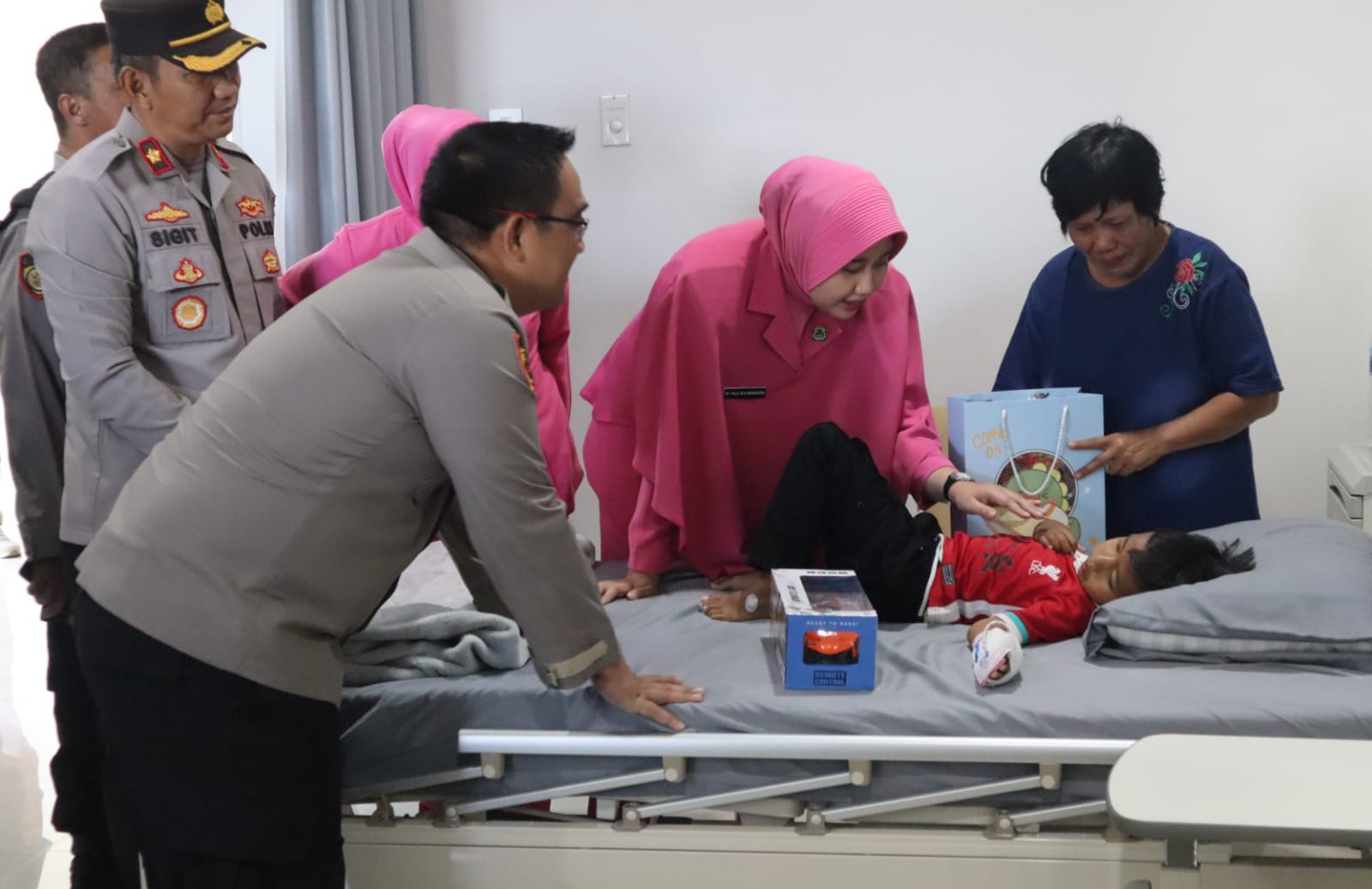 “Kami pantau kondisi para korban disini, salah satunya anak berusia 5 Tahun bernama Alfarisqi. Kami ajak bercengkrama dan bermain mainan anak anak guna menghilangkan trauma, karena Alfarisqi harus menjalani operasi patah tulang tangan dan bahu,” Jelas AKBP Oka.