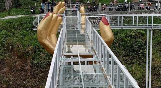 PURWOKERTO // Kupas Kriminal-Jembatan kaca The Geong dikawasan Wisata Hutan Pinus Desa Limpakuwus,Kec.Sumbang,Kab Banyumas,Jawa Tengah Rabu (25/10/2023) sekitar pukul 10.00 WIB pecah kacanya.