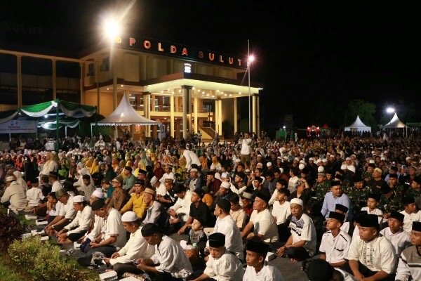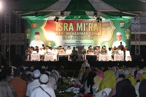Kurang lebih 10.000 jamaah hadir dalam peringatan Isra Mikraj 1445 H dan Istighosah yang digelar di halaman Presisi Polda Sulut, Jumat (8/3/2024) malam.