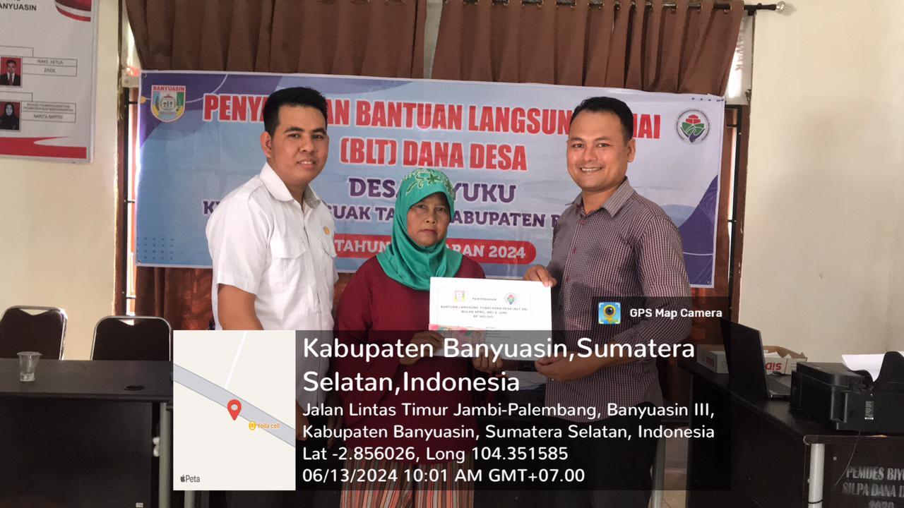 Pemerintah Desa (Pemdes)Biuku Kecamatan Suak Tapeh menyalurkan Bantuan Langsung Tunai Dana Desa (BLT-DD)Tahap ||.April ,Mei dan juni. Kepada Keluarga Penerima Manfaat (KPM) sebanyak 30 KPM, Bertempat di Kantor Desa Biuku Kecamatan Suak Tapeh Kabupaten Banyuasin Sumatra Selatan kamis 13/6/2024
