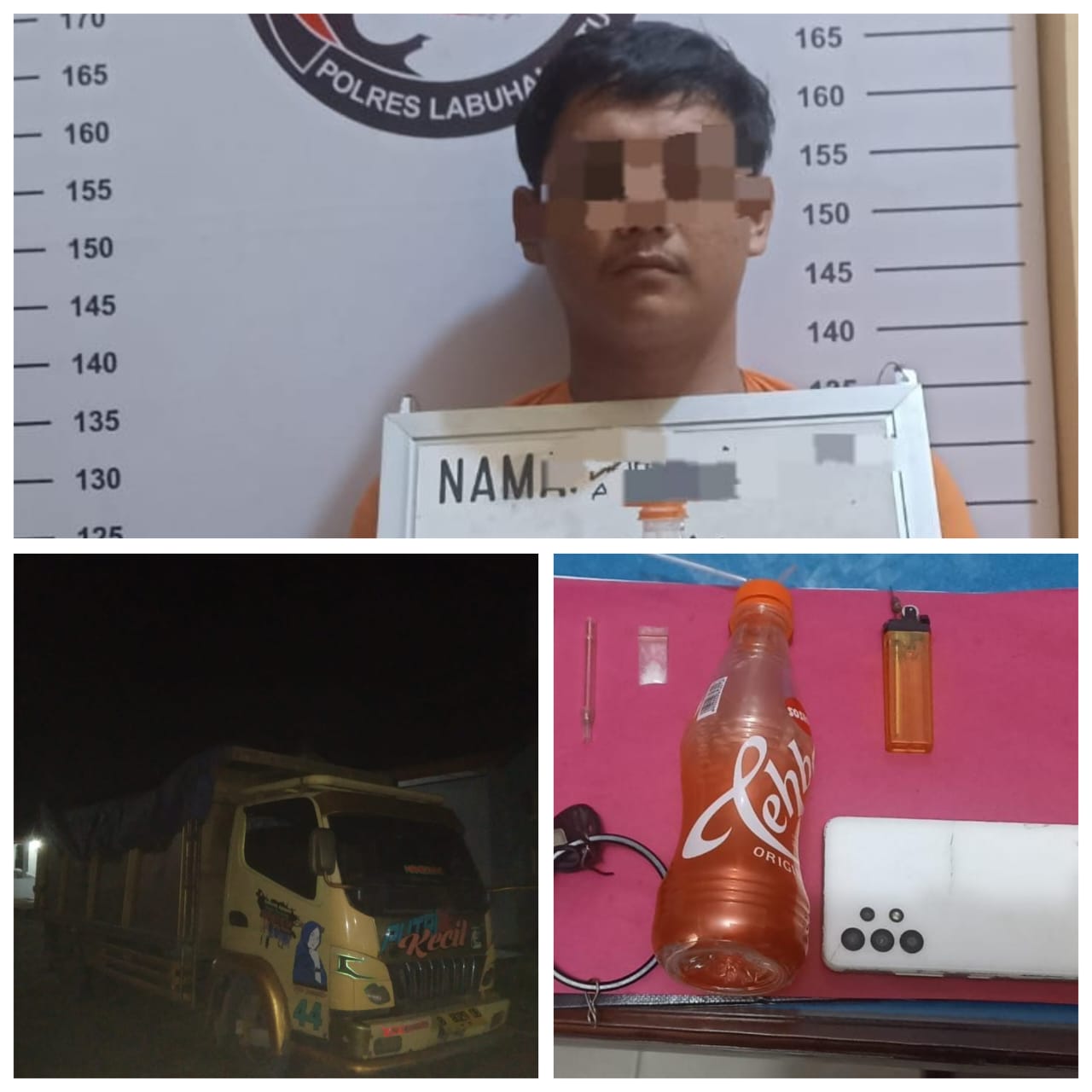 Selanjutnya Tim melakukan penggeledahan badan terhadap tersangka hasilnya Tim menemukan berupa 1(satu) bungkus plastik klip teasparan berisi diduga narkotika jenis Sabu-sabu seberat. 0.18 gram bruto, 1(satu) buah kaca pirex, bekas bakar diduga berisi narktika jenis Sabu-sabu seberat 1.21 gram bruto, 1(satu) buah Mancis. 1(satu) buah alat hisap atau Bong yang terbuat dari botol Teh botol 1(satu) buah Handphone Android merk SAMSUNG warna putih, 1( satu ) unit Damp Truck Mitsubishi dengan plat Polisi BK 8029 DR