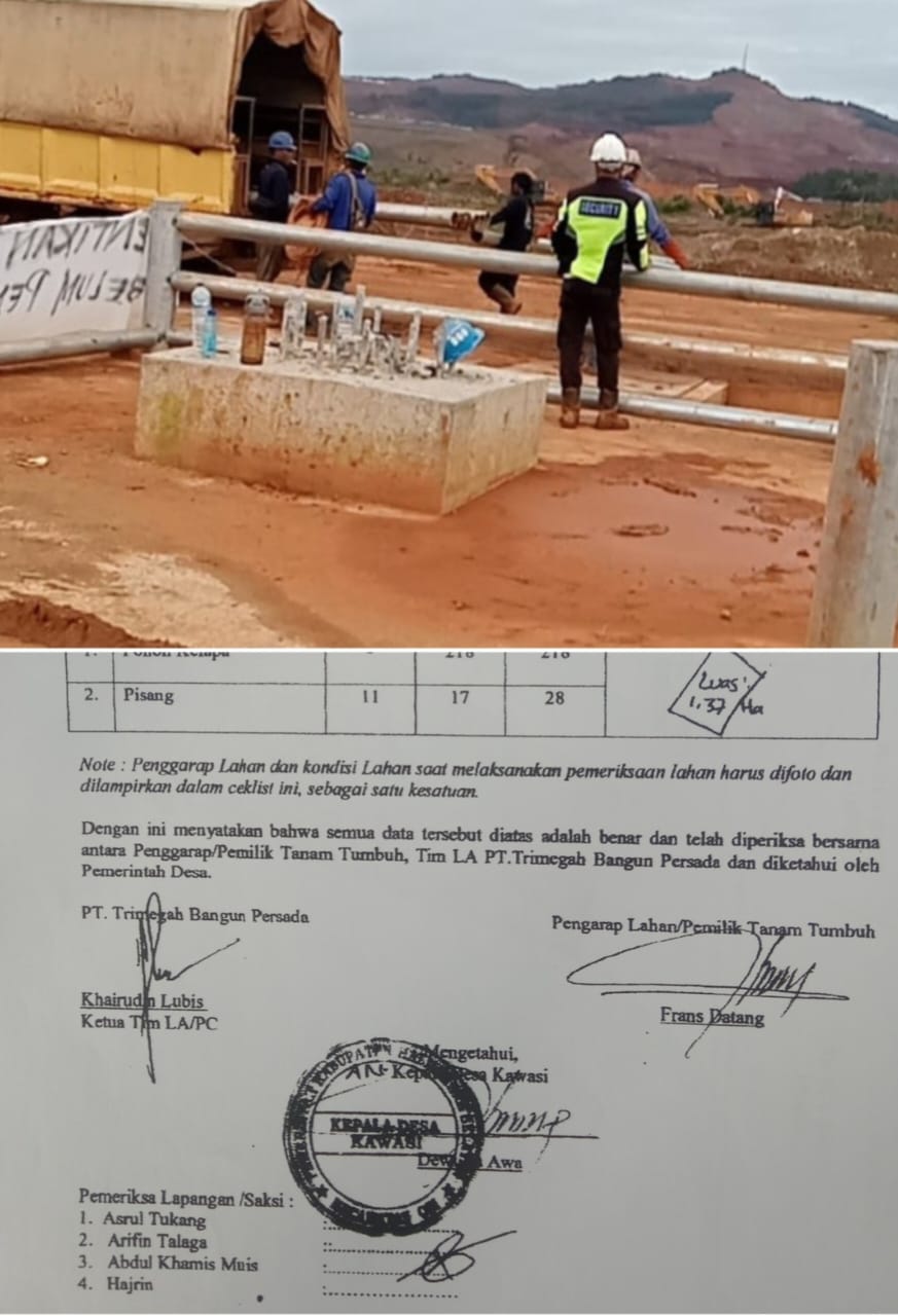 Kemudian surat peralihan kepemilikan lahan tersebut di tantangani oleh para saksi l Imam Laiwui La Goti La Ntei, dan saksi ll Kepala Desa (Kepala Kampung) Kawasi R. Langkodi, itu disertai dengan selembar peta sebagai petunjuk lokasi dan babatas-batasnya yang saat ini telah di lakukan penerobosan pihak PT Harita Grup mengusur habis tanam pohan kelapa di atas objek tersebut.