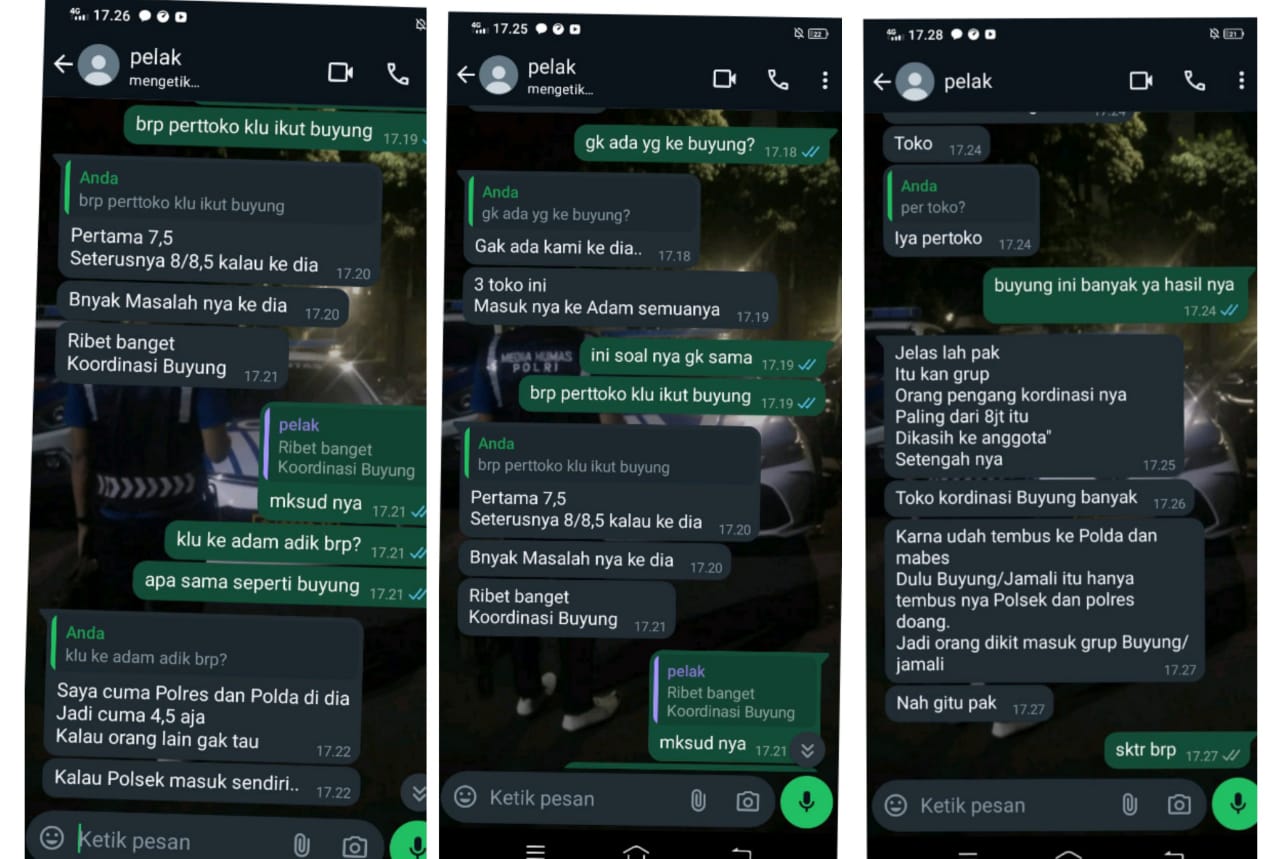 Dari hasil percakapan via whatsap dari salah satu Toko. ( bandar ) Mengungkapkan ” Sekarang tidak akan ada yang berani nutup kita sudah kordinasi sama Polda dan Mabes Ungkap Kordinator ( Buyung )