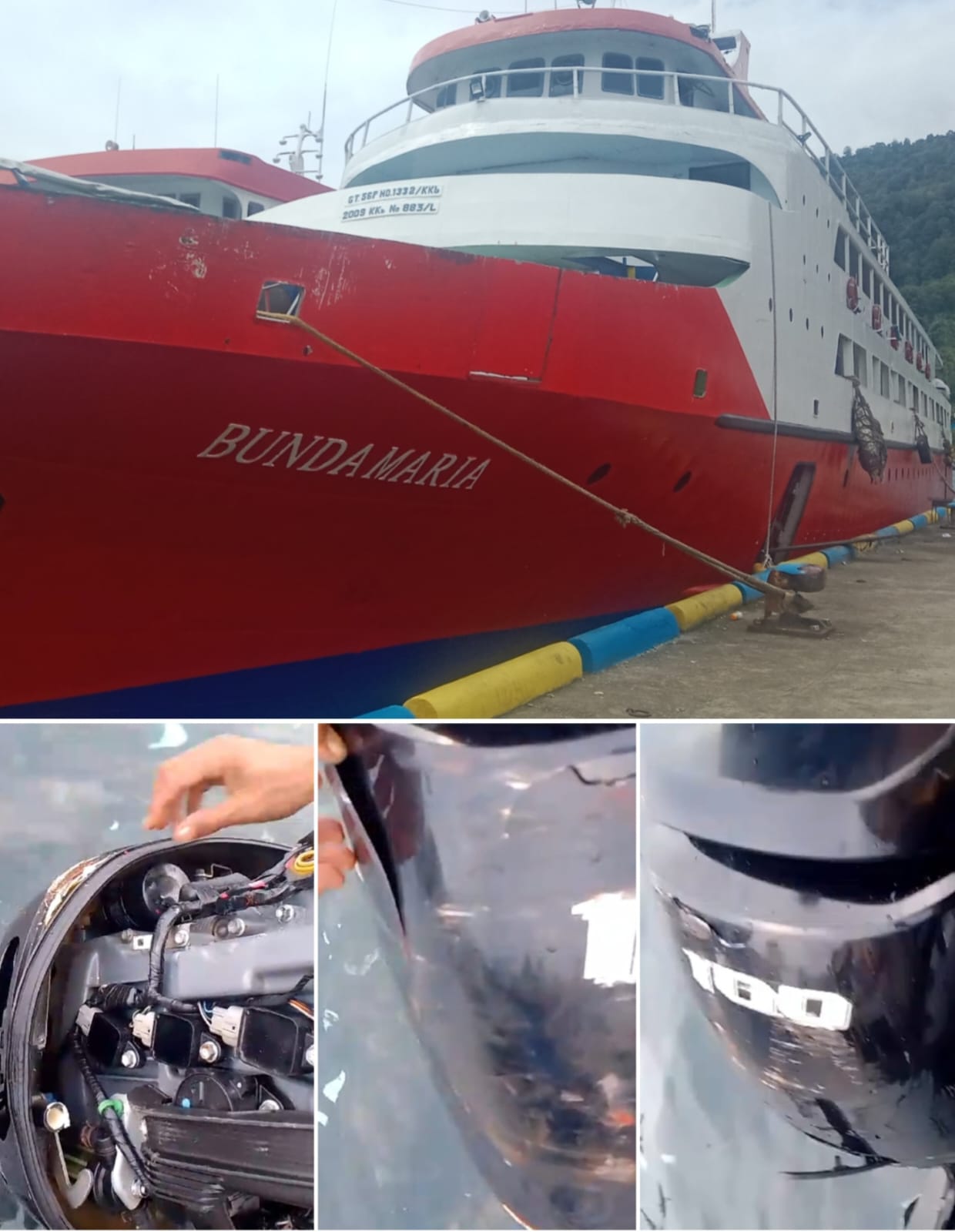 Akibatnya secara tiba-tiba kapal BUNDA MARIA langsung menabrak speed mengenai mesin 150 PK merek Zuzuki dua buah rusak di bagian penutup terbelah, dan kedua kaki mesin juga demikian rusak serta mesinnya tidak lagi normal ketika di hidupkan karena kena benturan terlalu kencang. Ungkap korban.