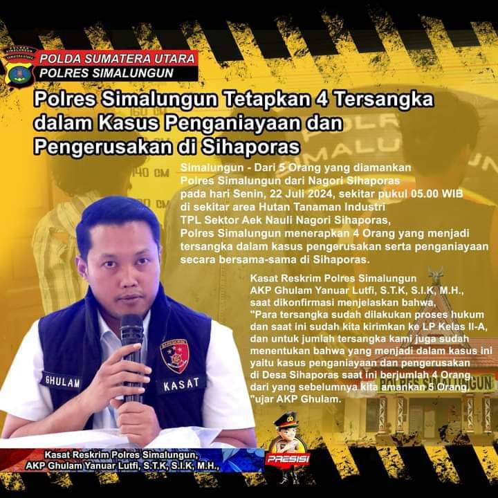 Dari 5 Orang yang diamankan Polres Simalungun dari Nagori Sihaporas pada hari Senin, 22 Juli 2024, sekitar pukul 05.00 WIB di sekitar area Hutan Tanaman Industri TPL Sektor Aek Nauli Nagori Sihaporas, Polres Simalungun menerapkan 4 Orang yang menjadi tersangka dalam kasus pengerusakan serta penganiayaan secara bersama-sama di Sihaporas.