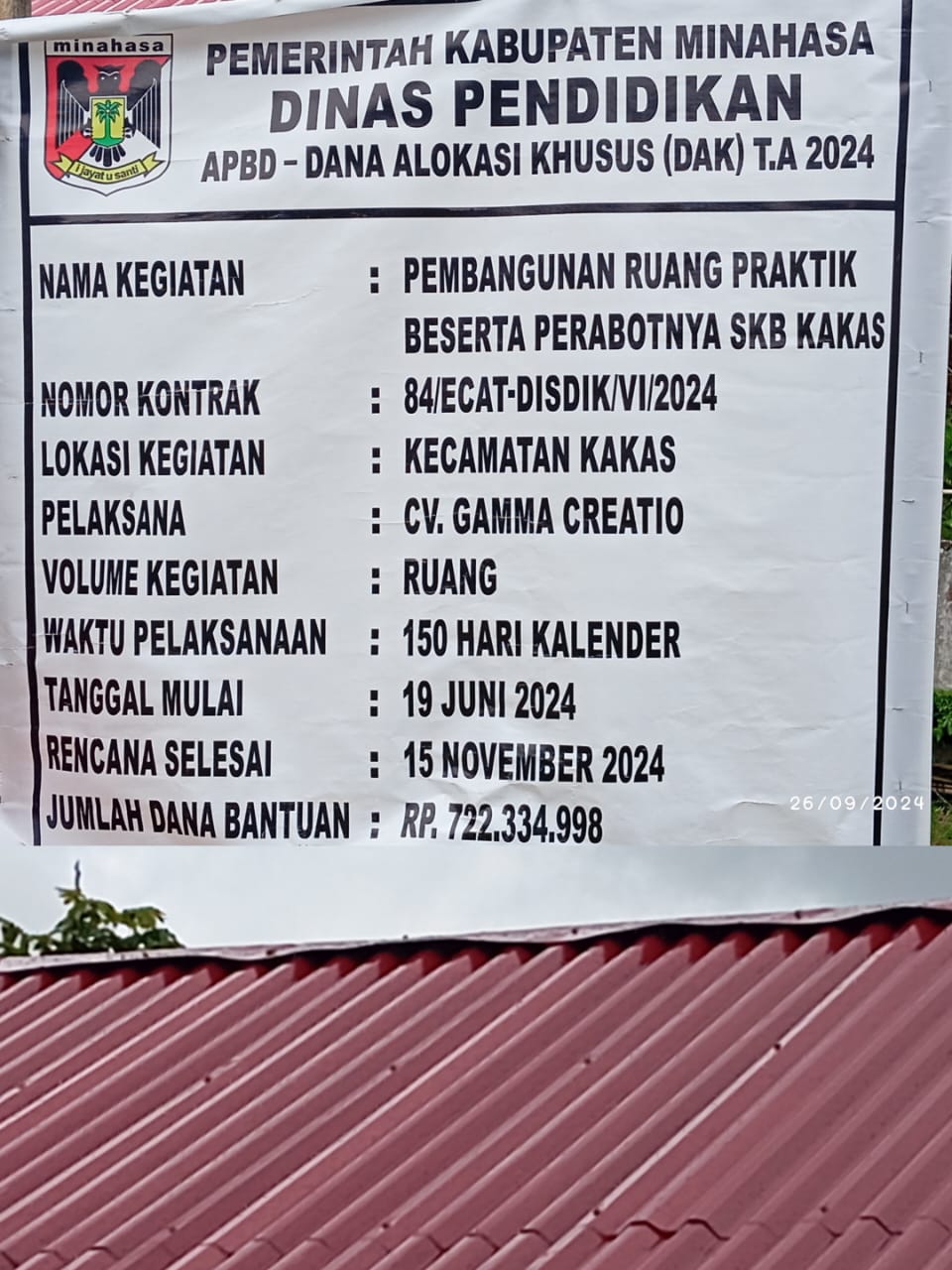 Pemerintah Kabupaten Minahasa, Sulawesi Utara (Sulut), melalui Dinas Pendidikan, melaksanakan proyek pembangunan ruang praktik beserta perabotnya di SKB Kakas. Namun, bumbungan atap bangunan tersebut diduga tidak sesuai dengan spesifikasi yang telah ditentukan.