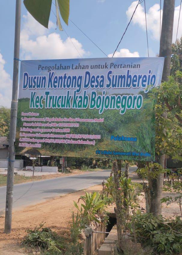 Diduga untuk akali Aparat Penegak Hukum, Pelaku usaha pertambangan tanah urug ilegal di Dusun Kentong, Desa Sumberejo, Kecamatan Trucuk, Bojonegoro, Jawa Timur, nekat pasang Banner informasi izin pengelolaan lahan pertanian di lokasi tambang, Senin 04 November 2024.