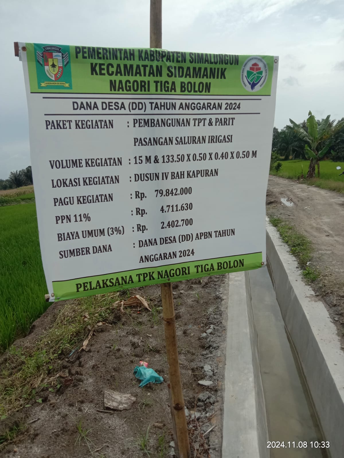Hasil liputan awak media di dampingi Kepala dusun Nagori Tiga Bolon bermarga Simanjuntak,Jumat, 8/11/2024 ,di titik lokasi kegiatan dusun IV Bahkapuran Nagori Tiga bolon telah diketahui adanya pola korupsi Oknum Pangulu Marisno Sitio sebagai pengguna Anggaran Dana Desa tahun 2024, sesuai Plank kegiatan yang ada ,menyebutkan kreteria Pekerjaan pembangunan tembok penahan tanah(TPT) serta pembuatan parit saluran irigasi, dengan volume TPT 15 m, parit pasangan 133.50 ,tipe 0.50.pagu kegiatan sebesar Rp. 79.842.000, sumber dana desa tahun anggaran 2024.
