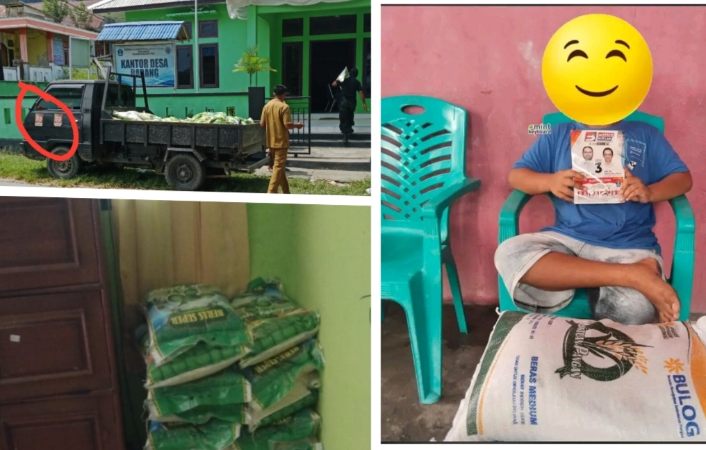 Beredarnya bukti foto pembagian sembako dua jenis beras Bulog dan super diduga kuat money politik dilakukan Pasangan Calon (Paslon) nomor urut 3 Basaam-Helmi, disalurkan melalui aparat Desa Babang kepada penerima.