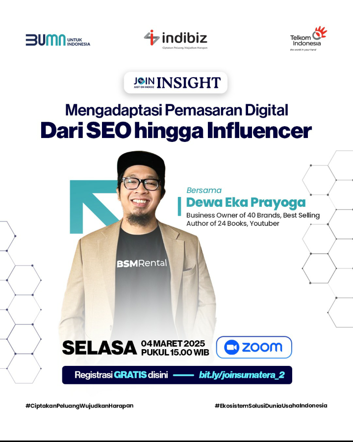 Indibiz Sumatera kembali mengadakan webinar menarik dalam seri JOIN Insight, kali ini menghadirkan Dewa Eka Prayoga, seorang Business Owner sukses dari lebih 40 brand, Best Selling Author dari lebih 20 buku, dan Youtuber dengan ratusan ribu subscriber. Webinar ini akan berlangsung pada tanggal 4 Maret 2025 dan bertujuan untuk memberikan wawasan mendalam tentang strategi pemasaran digital yang efektif.
