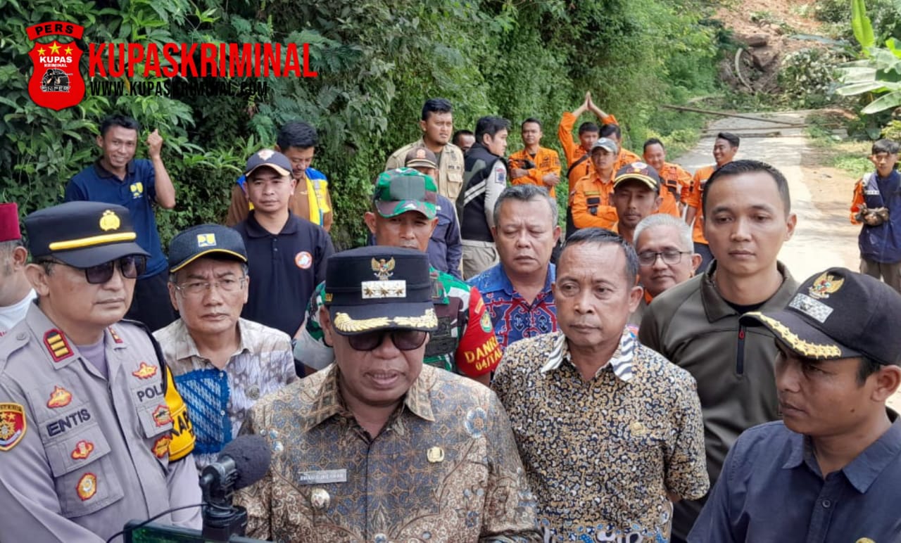 Bupati Majalengka Eman Suherman yang turut didampingi Danramil 1704/Talaga Kapten Inf Subagyo mengunjungi lokasi musibah longsor di Cigondok, Blok Margaluyu, Desa Margamukti, Kecamatan Talaga, Kabupaten Majalengka, pada Kamis (6/3/2025).