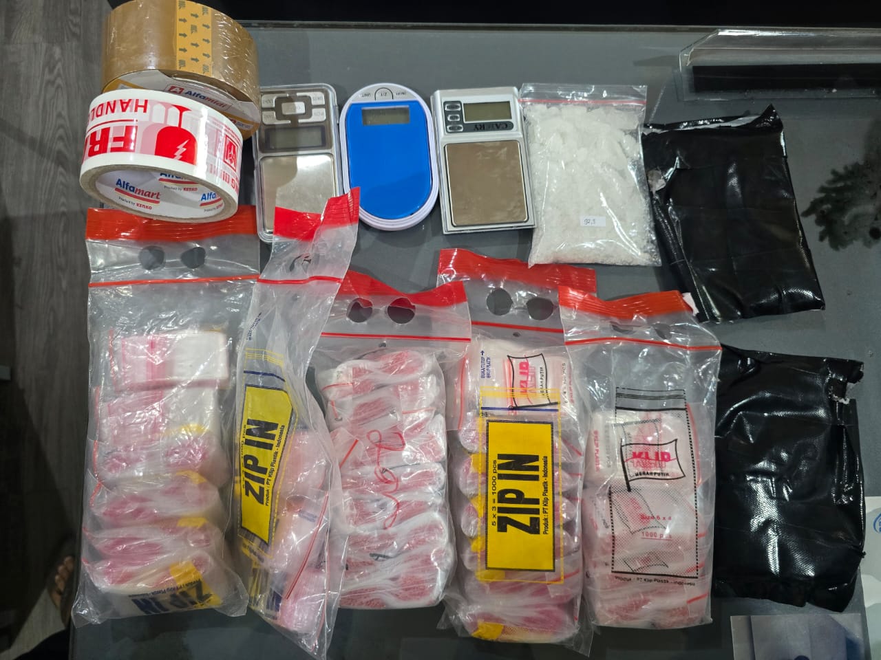 “Anggota juga mengamankan sepeda Motor Honda Beat No. Pol W 2219 NGC, 31 potongan lakban warna Putih motif tulisan warna Merah, 12 potongan kemasan bekas penyedap rasa merk Masako, 16 potongan lakban warna Coklat, 3 timbangan elektrik, lakban, dompet, 2 buah sekrop dari sedotan Plastik dan 29 pak plastik klip kosong,” jelas AKBP Suria Miftah Irawan, Rabu (23/4/2025).