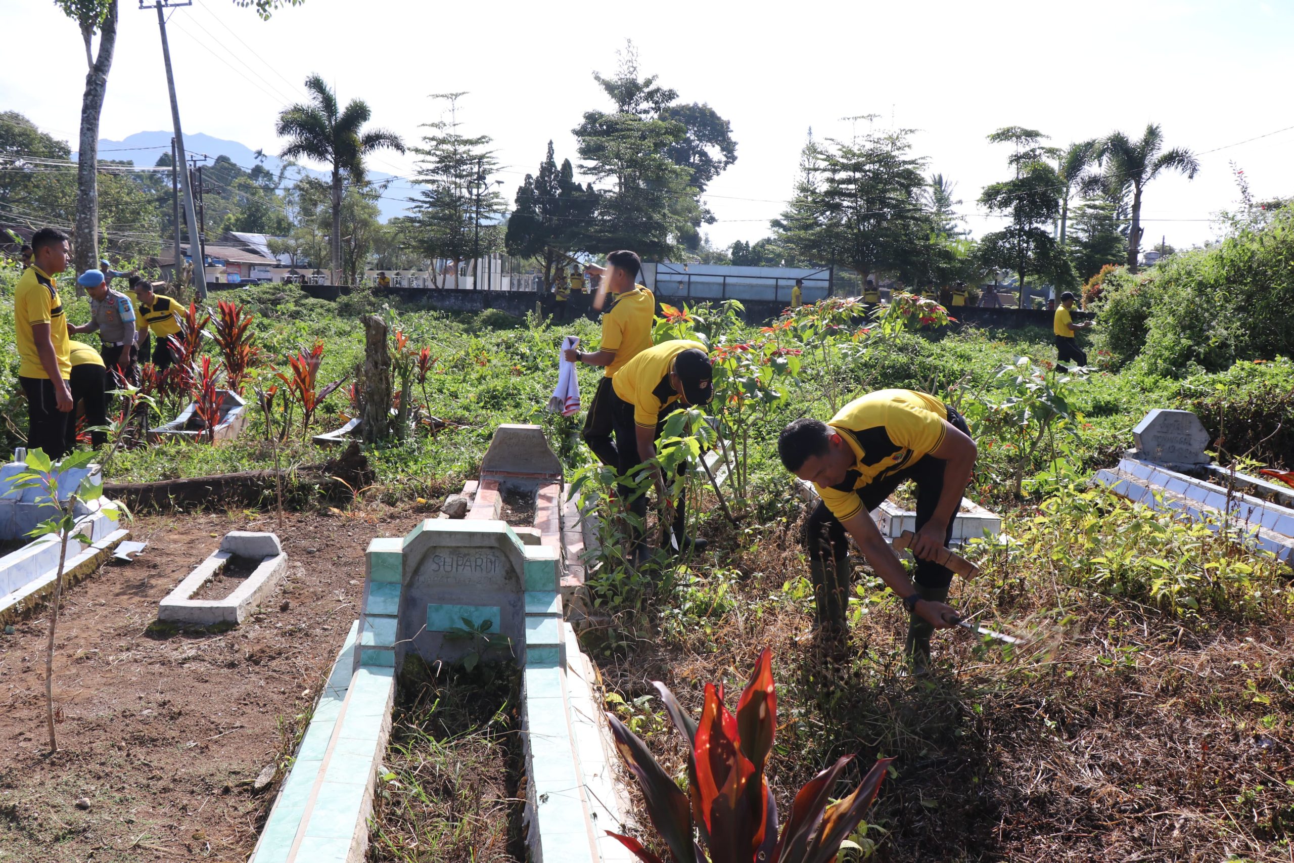 Dalam rangka menyambut Hari Bhayangkara ke-79, Polres Lampung Barat melaksanakan kegiatan bakti sosial religi berupa gotong royong membersihkan Tempat Pemakaman Umum (TPU) di Pekon Wates, Kecamatan Balik Bukit, Kabupaten Lampung Barat.