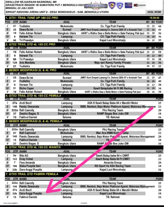 Prestasi membanggakan kembali ditorehkan oleh putri daerah Lampung. Dara Geboy, pembalap muda berbakat asal Pekon Baru Api, berhasil meraih posisi keempat (Podium 4) dalam ajang Kejuaraan Nasional (Kejurnas) Grasstrack Region 1, yang digelar di Sirkuit Non Permanen Kodong Benu Unit 1, Desa Wono Harjo, Kecamatan Giri Mulya, Kabupaten Bengkulu Utara, Minggu (20/07/2025).