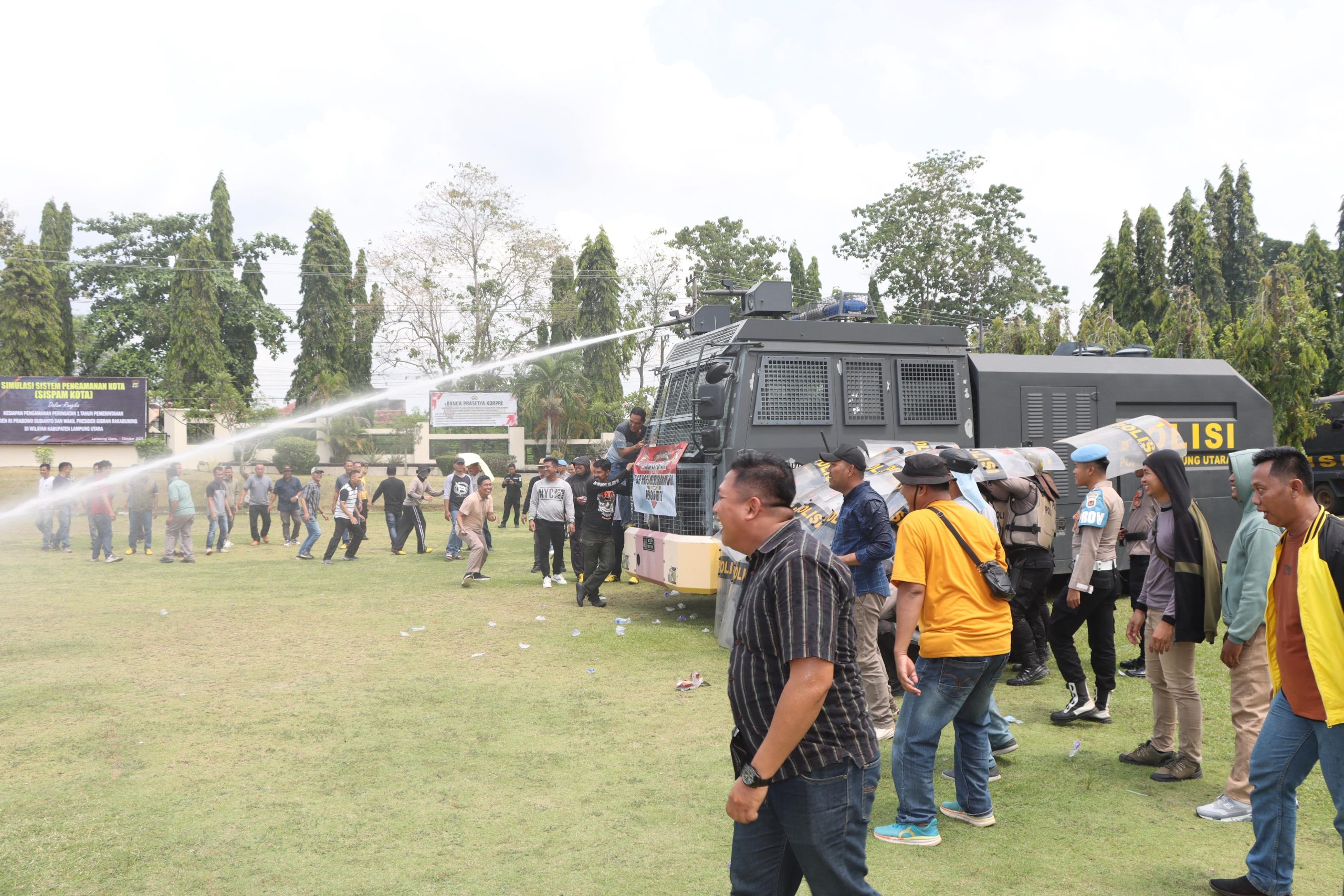 Simulasi Sispam Kota diawali dengan skenario adanya massa yang tidak puas terhadap kinerja pemerintah dan menggelar aksi unjuk rasa, menghadapi situasi tersebut, personel Polres Lampung Utara secara bertahap melakukan pengendalian sesuai prosedur, mulai dari upaya persuasif, negosiasi, hingga pembubaran massa dengan formasi Dalmas.