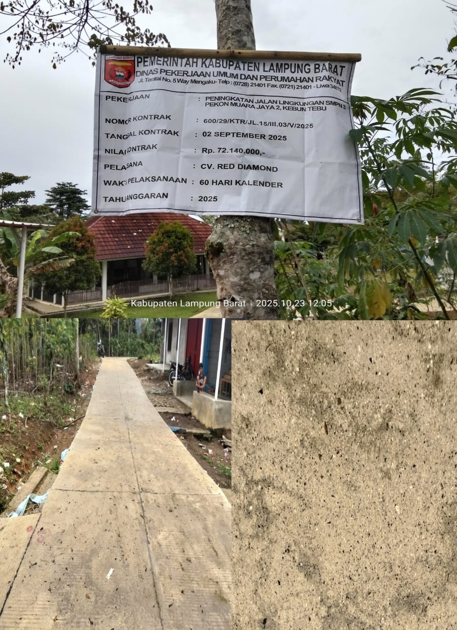 Ciri-ciri fisik jalan yang sudah tampak rusak — seperti tekstur kasar, beton terkelupas, dan permukaan berpasir — memperkuat dugaan bahwa pekerjaan dilakukan dengan mutu rendah. Hal ini tentu bertentangan dengan komitmen Pemerintah Kabupaten Lampung Barat dalam meningkatkan infrastruktur yang berkualitas dan berdaya guna.