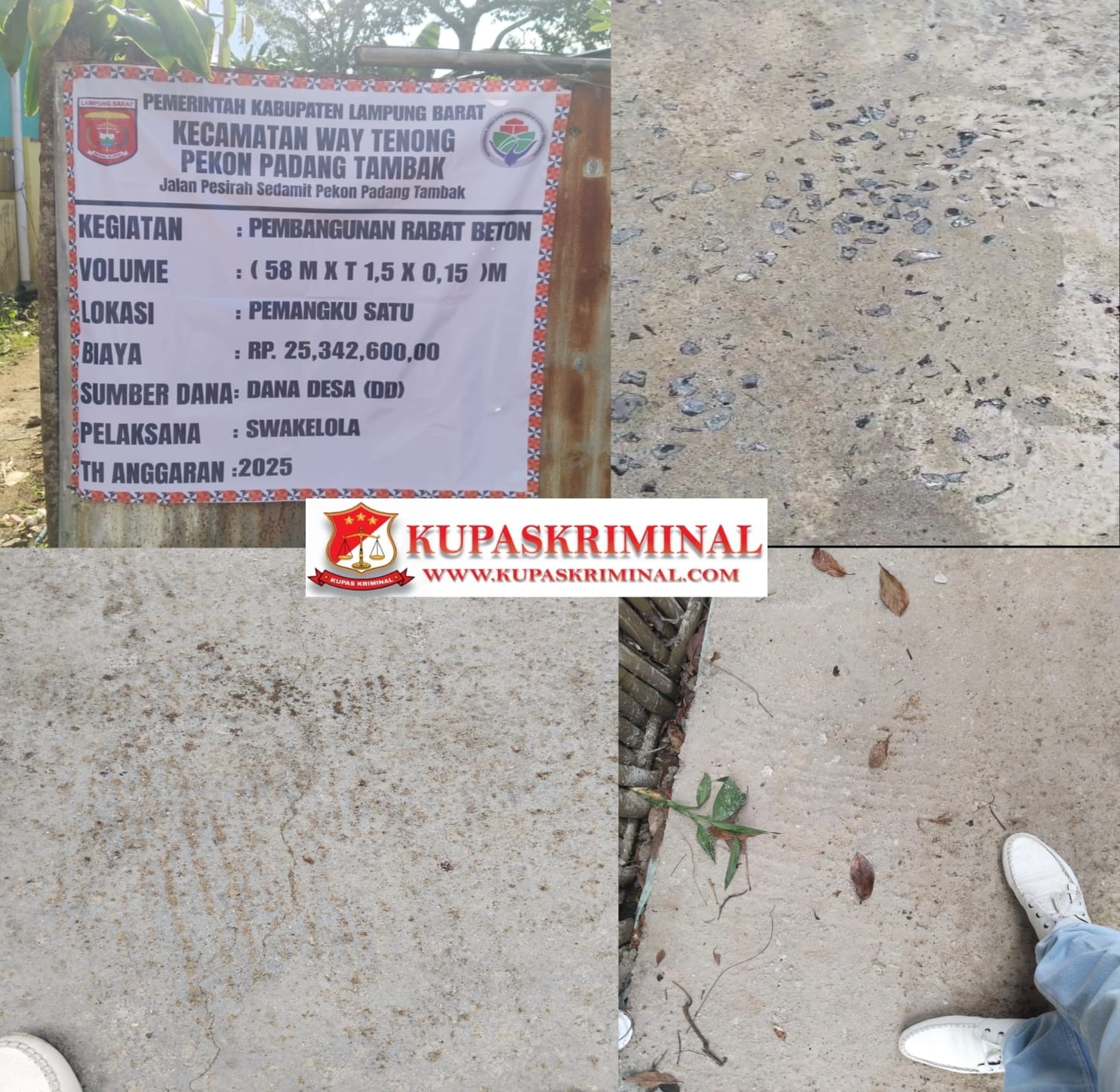 Aroma busuk dugaan penyimpangan dana desa kembali tercium di Kabupaten Lampung Barat, Kali ini mencuat dari Pekon Padang Tambak, Kecamatan Way Tenong, tempat proyek pembangunan rabat beton yang bersumber dari Alokasi Dana Desa (ADD) menjadi buah bibir warga.