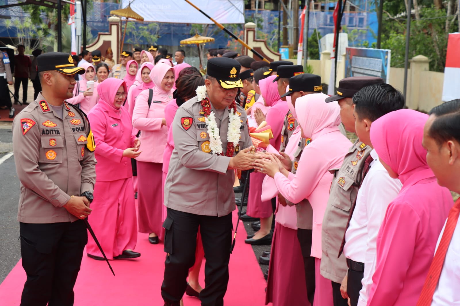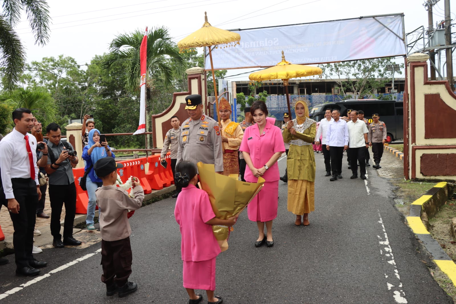 Prosesi penyambutan diawali oleh Kapolres Bangka Barat AKBP Pradana Aditya Nugraha, S.H., S.I.K., yang menerima langsung Kapolda di halaman Mako. Salah satu momen istimewa terjadi ketika Polisi Cilik (Pocil) mengalungkan bunga kepada Kapolda, simbol penghormatan dan kedekatan Polri dengan generasi muda. Seluruh personel kemudian melakukan salaman dan salam hormat, menciptakan suasana hangat dan penuh kebersamaan.