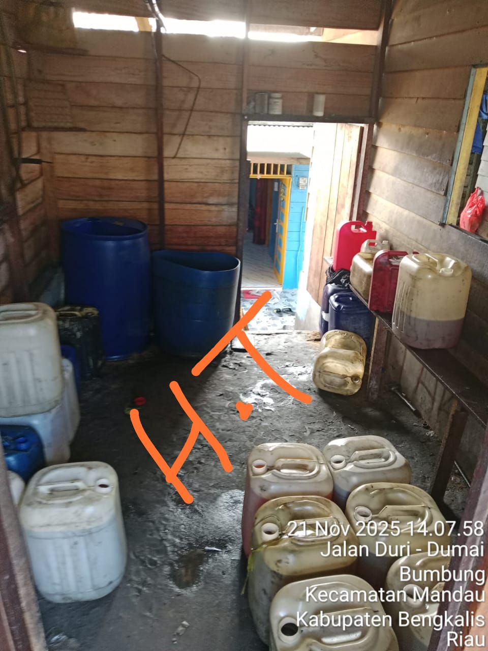 Foto yang diambil pada Jumat, 21 November 2025, pukul 14.07 WIB ini menjadi bukti telanjang betapa parahnya praktik ilegal yang sudah menjadi rahasia umum di wilayah Bathin Solapan. Di dalamnya, tumpukan ratusan jeriken plastik berbagai ukuran berjejer, ditambah beberapa drum besar berwarna biru yang siap menampung ribuan liter minyak haram.