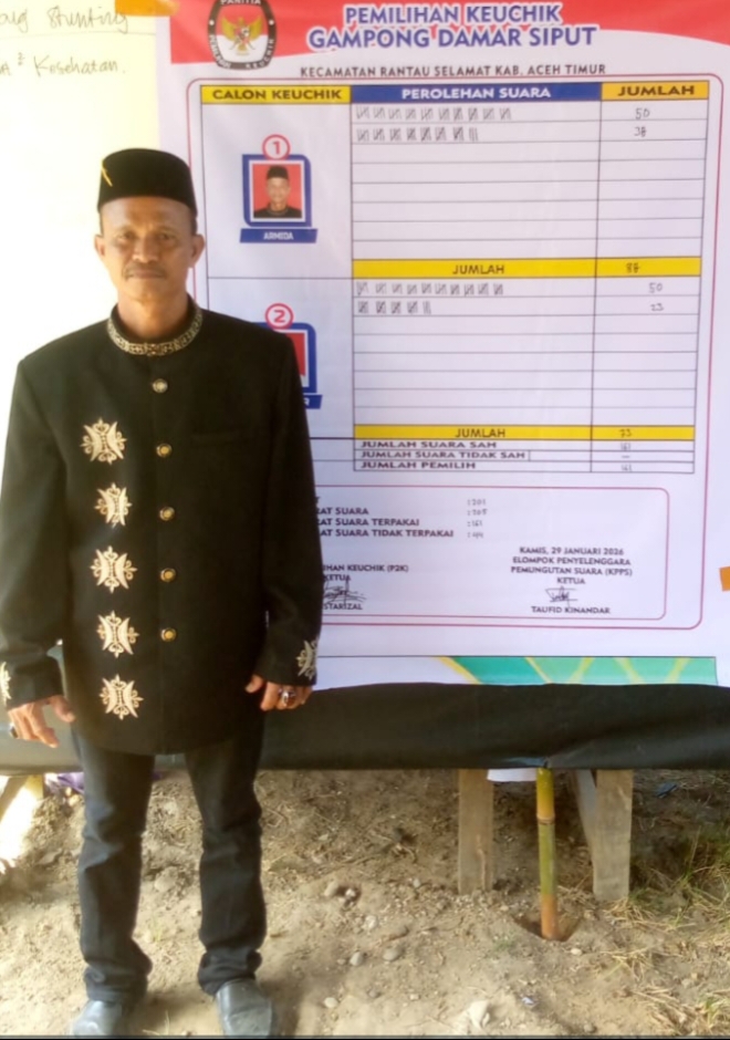 Untuk itu saudara Armida secara sah terpilih sebagai Keuchik Gampong Damar Sipot periode 2026-2031 mendatang.Ungkap ketua P2K Mustarijal.