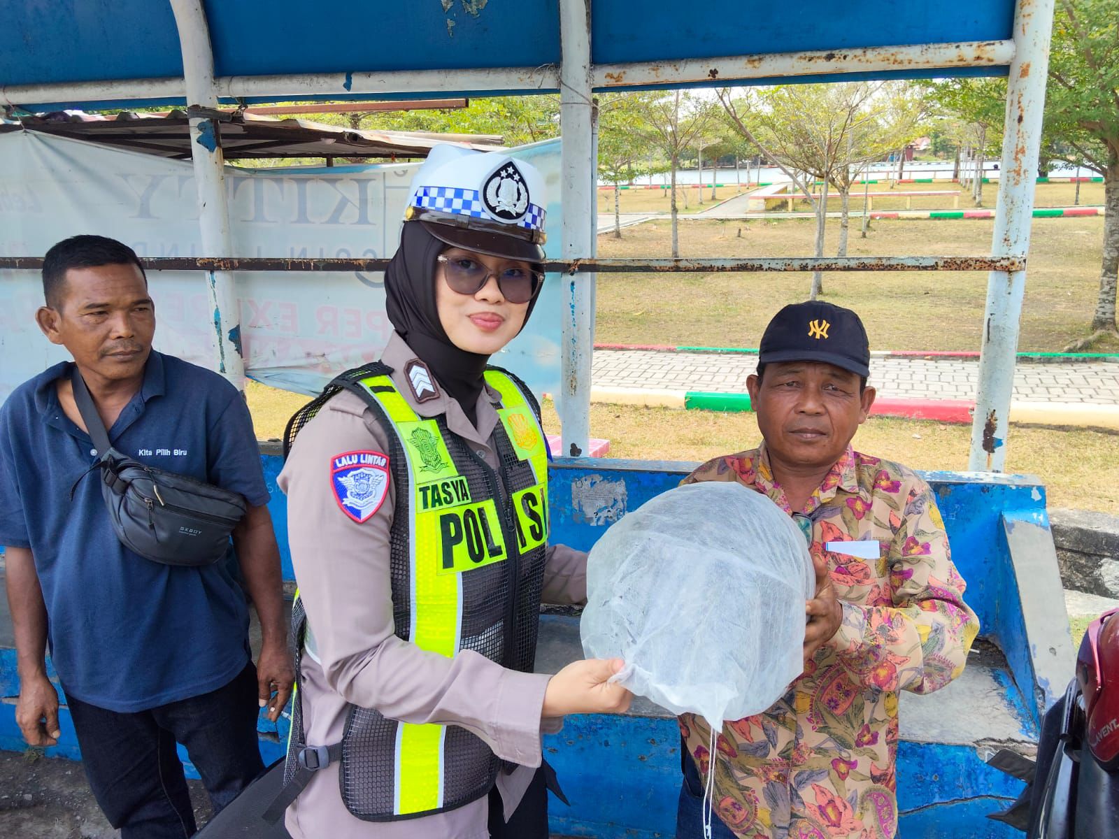 Brigpol Yuliana Fivmawati, S dan Brigpol Tasya Sharendita. Melalui kegiatan ini, diharapkan para pengemudi ojek konvensional semakin memahami pentingnya penggunaan helm serta mematuhi aturan lalu lintas demi keselamatan diri sendiri maupun pengguna jalan lainnya.